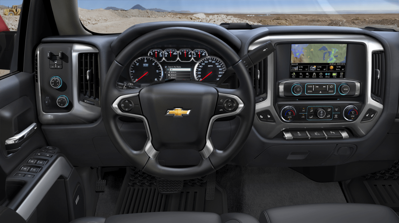 Interior studio press photo of the 2014 Chevrolet Silverado LTZ dashboard, featuring the leather-wrapped steering wheel with bowtie badge, analog gauges, and the MyLink infotainment system with navigation map display.