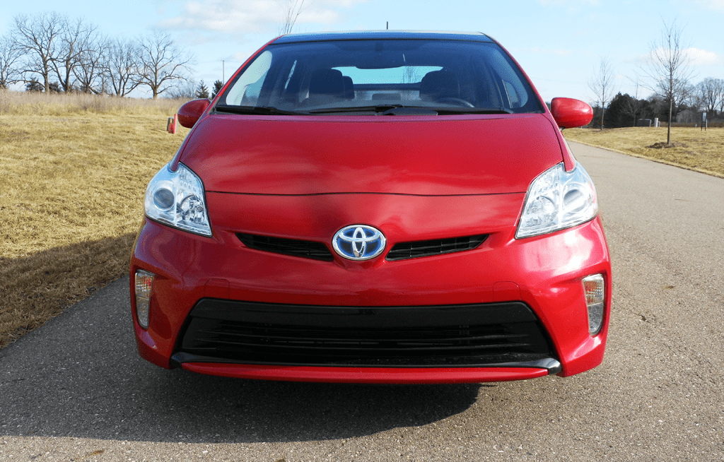 Head-on front view of the 2012 Toyota Prius Four in red, showing the wide lower grille opening, Toyota badge, swept headlights, and dual fog light housings. The aggressive front fascia styling contrasts with the Prius's fuel-efficient reputation.