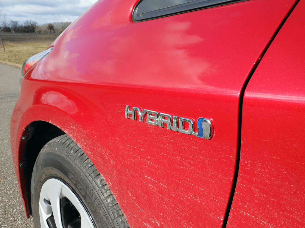 The chrome "HYBRID" badge with its distinctive blue accent stripe sits on the rear quarter panel of the 2012 Toyota Prius Four, subtly signaling its fuel-saving credentials. The fender flare and low-profile tire design are also visible in this close-up shot.