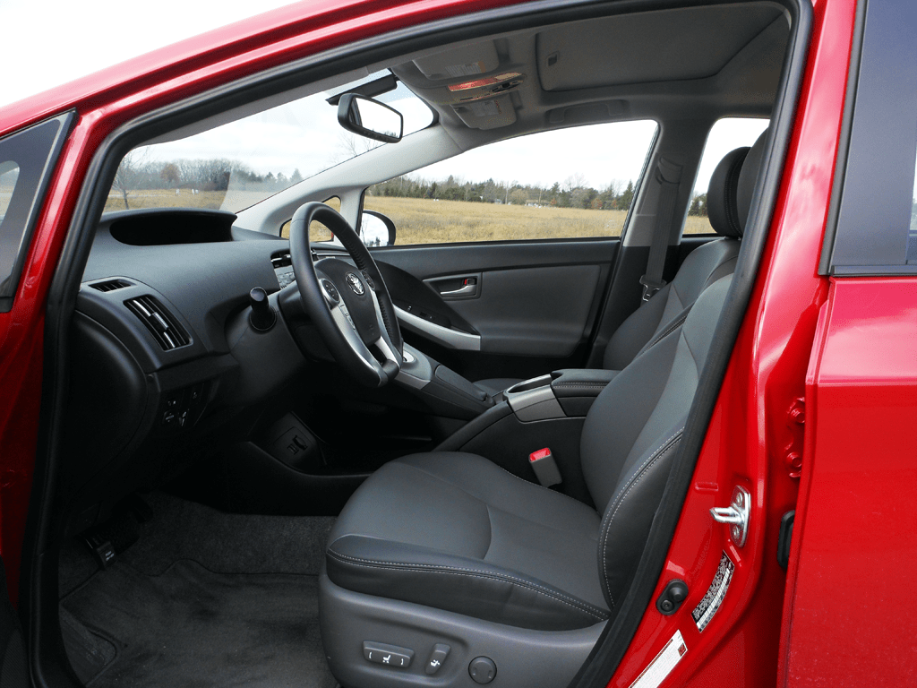Interior view of the 2012 Toyota Prius Four through the open driver's door, showing the dark gray cloth front seats, center console, and the elevated center instrument display cluster. The wide door opening and low sill height make entry and exit easy.
