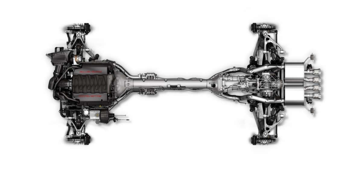 An overhead engineering photograph of the complete drivetrain and suspension layout of the 2014 Chevrolet Corvette Stingray, showing the LT1 V8 engine, torque tube driveshaft, rear-mounted transmission, and independent rear suspension on a white background.