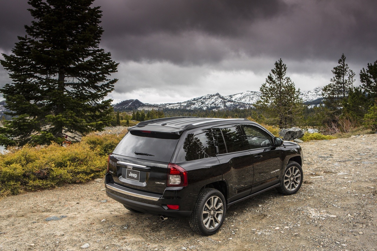 The rear three-quarter view of the 2014 Jeep Compass Sport shows its updated taillights and clean liftgate design against a dramatic mountain backdrop. The Compass Limited badge is visible, showcasing the refreshed rear fascia treatment Jeep introduced at Detroit.