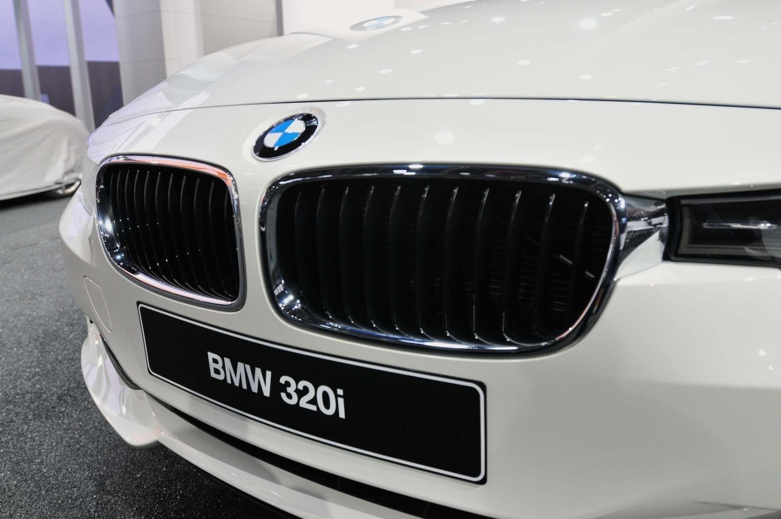 A tight close-up frames the twin kidney grilles and BMW roundel on the white 2013 320i sedan at the Detroit Auto Show. The chrome-trimmed nostrils and bold hood line are hallmarks of BMW's F30 3 Series design language.
