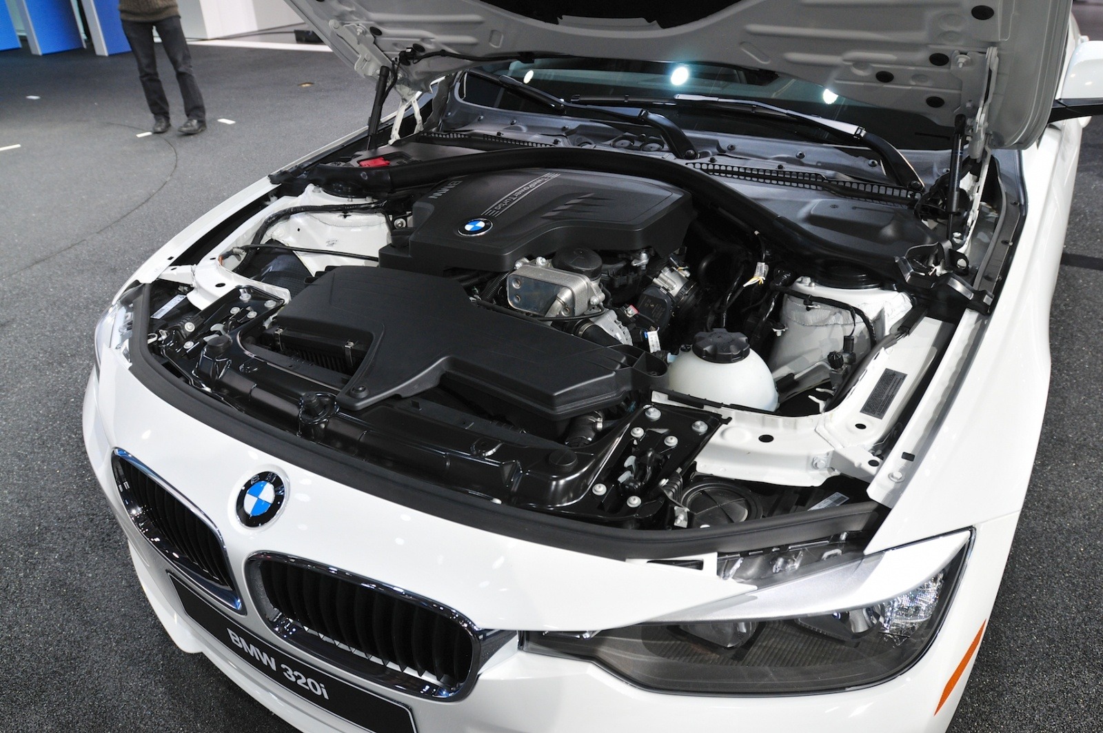 The hood-up engine bay shot of the 2013 BMW 320i reveals the turbocharged 2.0-liter four-cylinder at the Detroit Auto Show. The compact but potent N20 engine was a new addition to the U.S. 3 Series lineup, replacing the naturally aspirated six-cylinder in the base model.