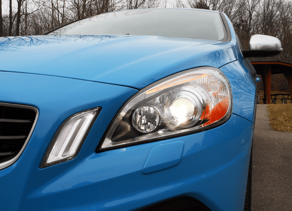 The 2013 Volvo S60 R-Design features projector headlights with distinctive daytime running light elements that give the car an immediately recognizable face. Against the vivid Rebel Blue paint, the chrome headlight surround adds a premium touch to the R-Design's athletic front end.