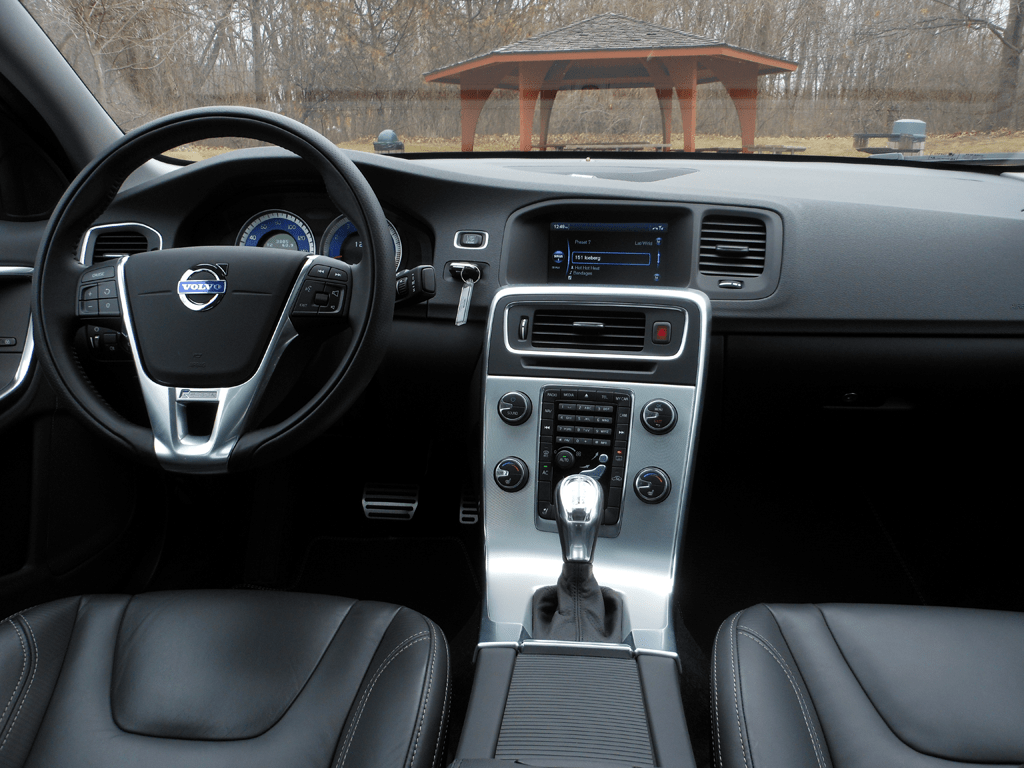 The 2013 Volvo S60 T6 AWD R-Design cockpit is defined by its signature vertical center stack, housing audio, climate, and navigation controls in a clean, intuitive layout. The R-Design adds sport-oriented detailing to the already distinctive Volvo interior architecture.