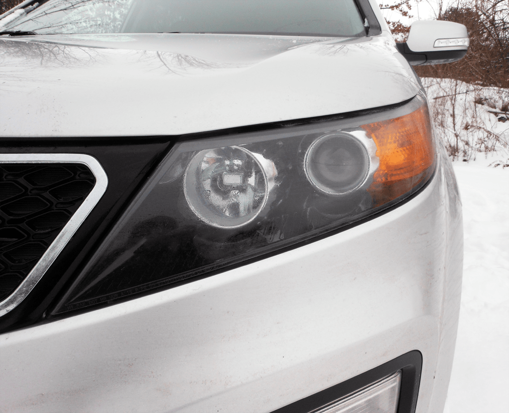 Close-up of the 2013 Kia Sorento SX's projector headlight assembly in snowy conditions, showing the dual projector lenses, chrome bezels, and turn signal reflector. The SX trim's upgraded lighting package is clearly visible in this detail shot.