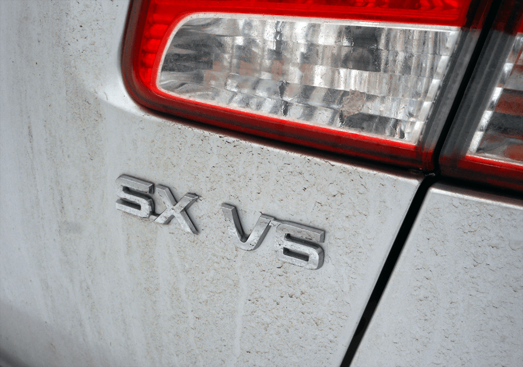 Detail shot of the chrome SX V6 trim badge on the rear of the 2013 Kia Sorento, located adjacent to the taillight assembly. The badge confirms the top-level SX trim and identifies the 3.5-liter V6 engine option, both visible against the silver paint with a light dusting of road grime.