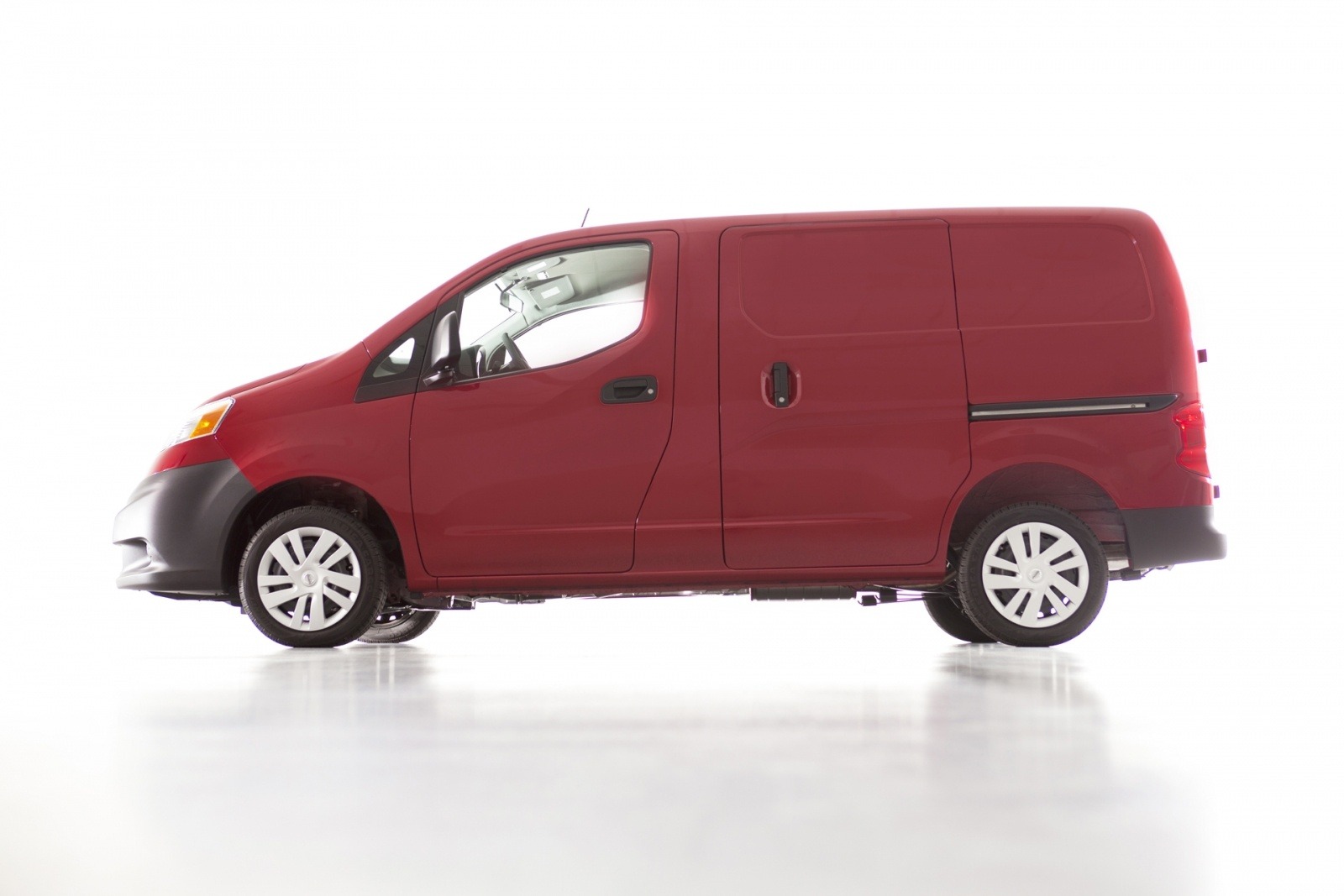 A clean side profile of the Nissan NV200 Taxi in red against a white studio background, showing the van's tall roofline, sliding passenger door, and compact footprint. The NV200's boxy proportions maximize passenger and cargo space within a body shorter than many full-size sedans.