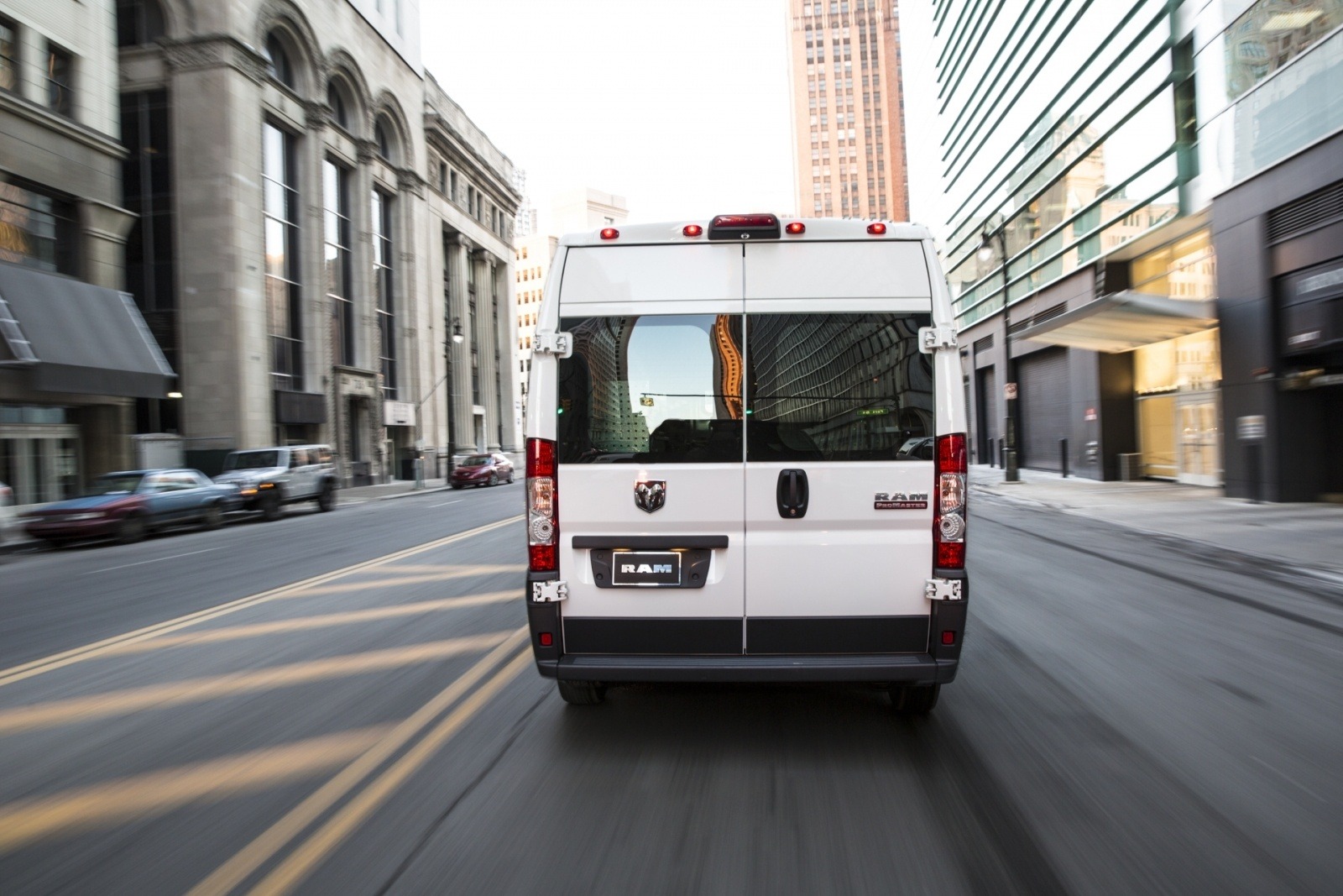 The rear of the 2014 Ram ProMaster fills the frame as it navigates a downtown street, the Ram badge and dual rear doors clearly visible above the low bumper. The square, upright tailgate design maximizes cargo door opening height, a key advantage for commercial operators loading tall freight.