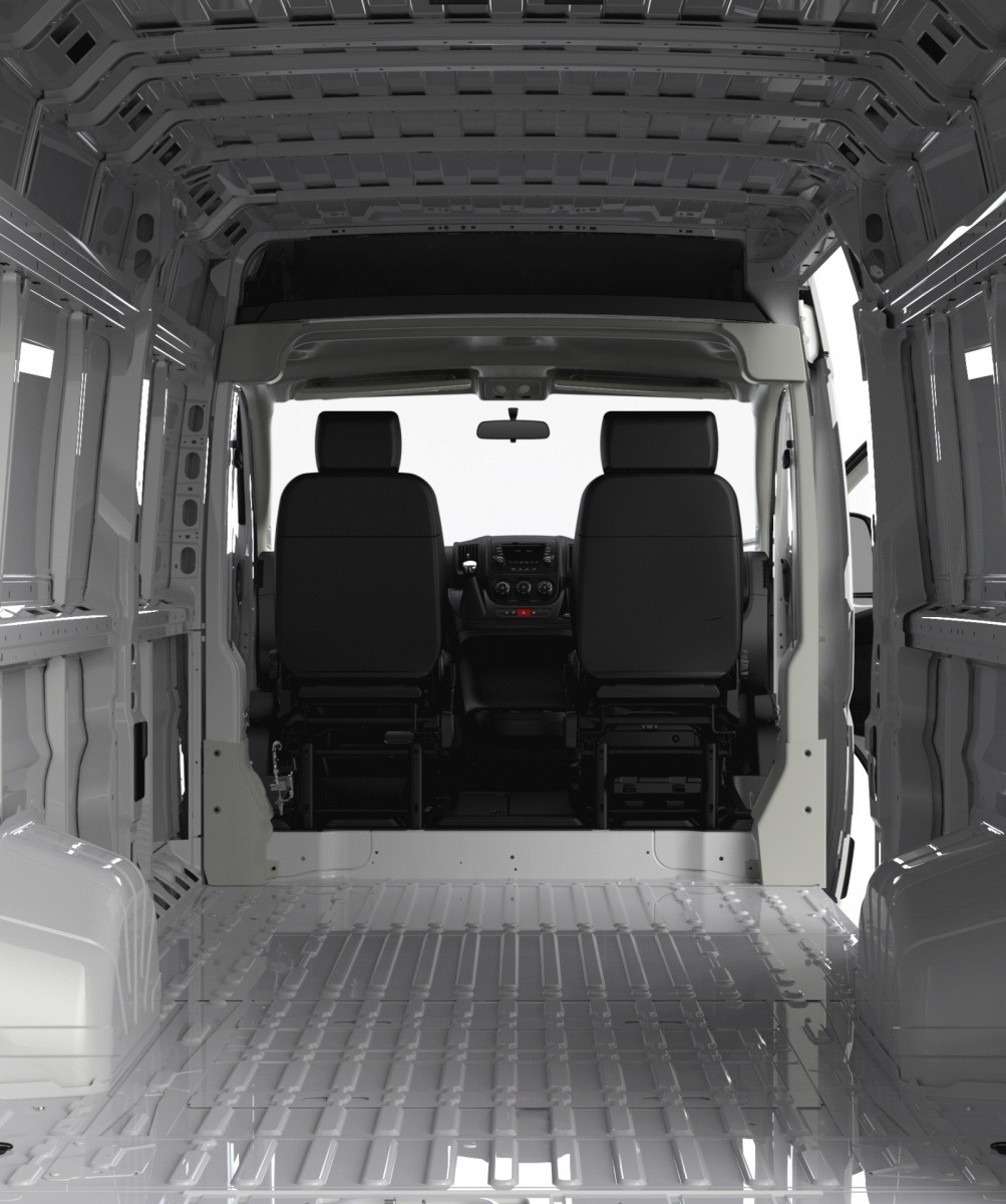 Looking forward from the rear of the 2014 Ram ProMaster, the empty cargo bay reveals a bare metal floor, reinforced side walls, and a high roof that allows standing room for workers. The view toward the dual front seats highlights just how much usable space the ProMaster delivers for commercial operators.