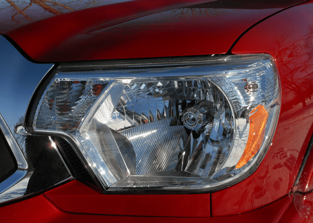 A close-up of the 2013 Toyota Tacoma SR5 composite headlight assembly, showing the multi-reflector design with integrated amber turn signal and chrome inner housing against the truck's red bodywork.