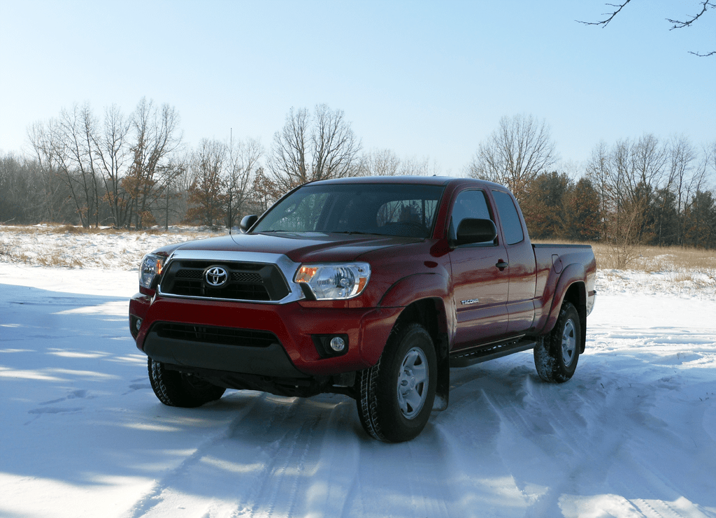 A head-on view of the 2013 Toyota Tacoma Access Cab SR5 in winter, highlighting the aggressive front fascia, dual-bar grille with Toyota badge, and composite headlights. Tracks in the snow demonstrate the truck's 4WD capability.