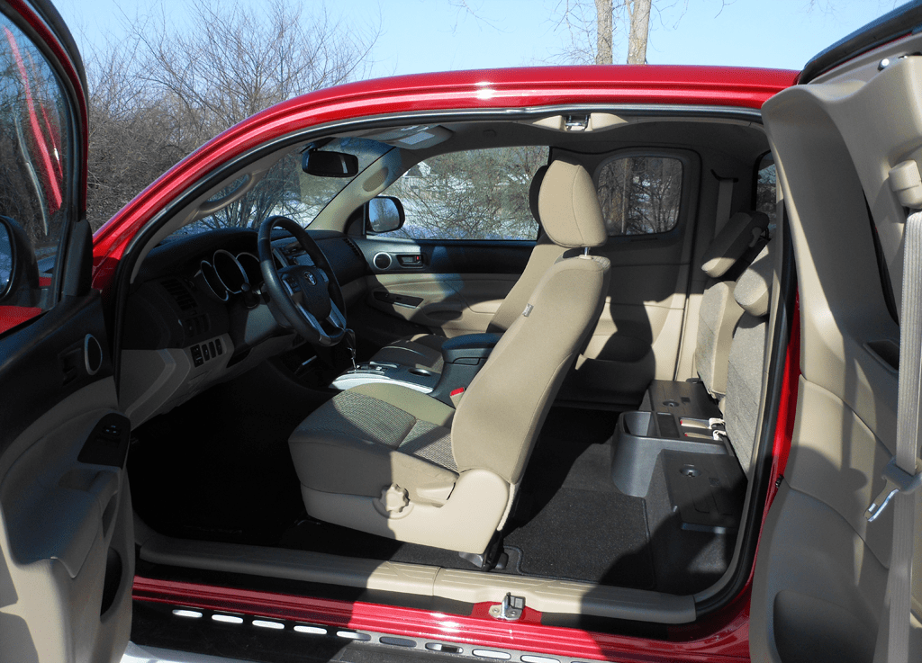 View from the open rear door of the 2013 Toyota Tacoma SR5 Access Cab, showing the fold-up rear jump seat area and the passenger-side front seat. The Access Cab's rear seating is useful for occasional passengers but is tight on legroom.