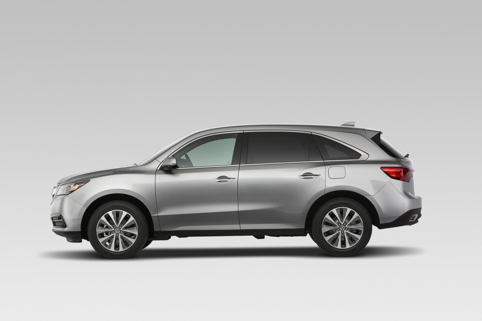 A clean studio side-profile press photo of the 2014 Acura MDX in silver, showing the SUV's sweeping roofline, flush door handles, and five-spoke alloy wheels. The profile highlights the MDX's longer wheelbase and sleeker silhouette compared to its predecessor.
