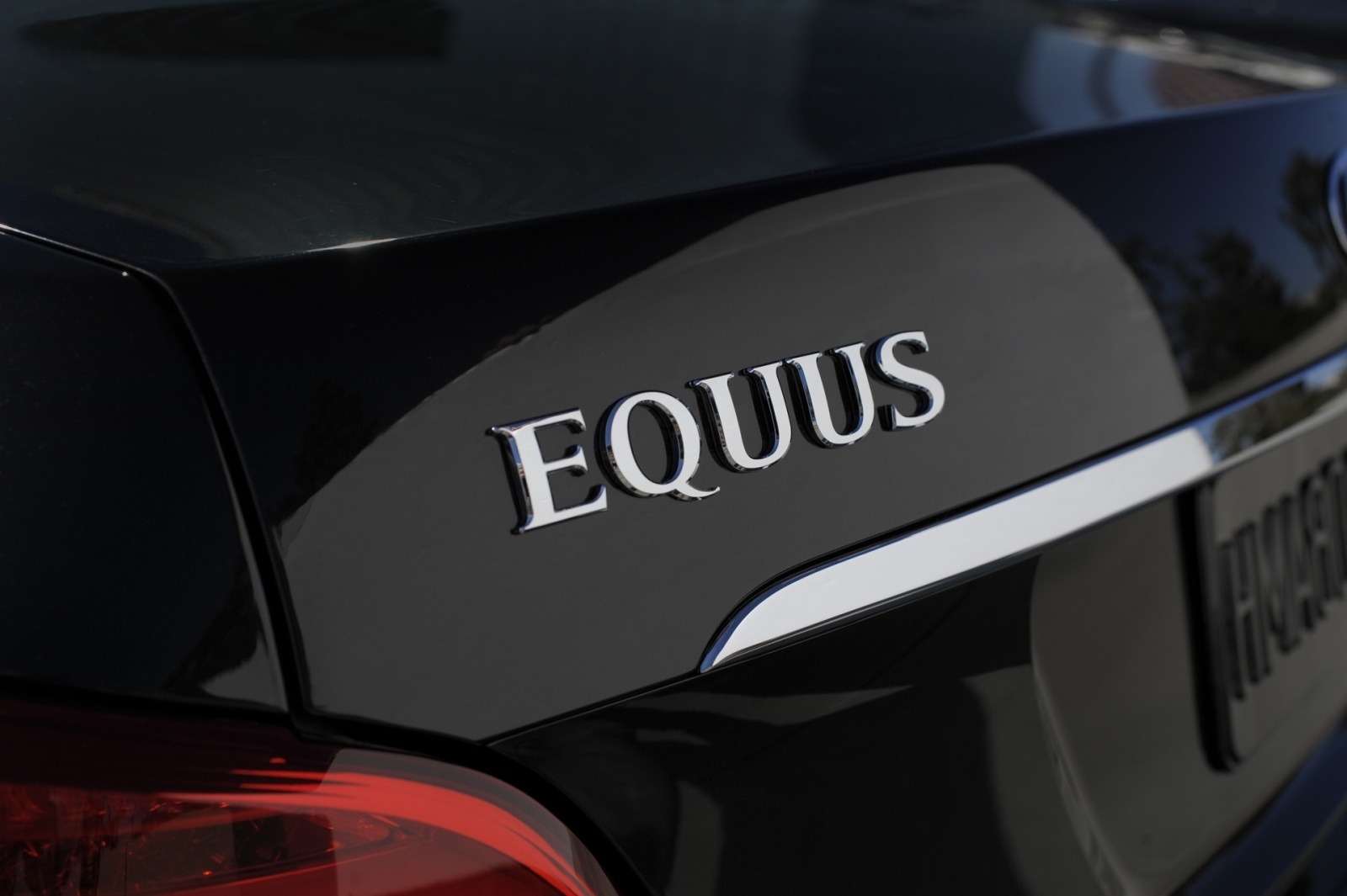 The "EQUUS" chrome script badge on the trunk lid identifies Hyundai's flagship sedan, rendered in polished lettering that reinforces the model's premium positioning. The close-up detail highlights the precise fit and finish expected at this price point.