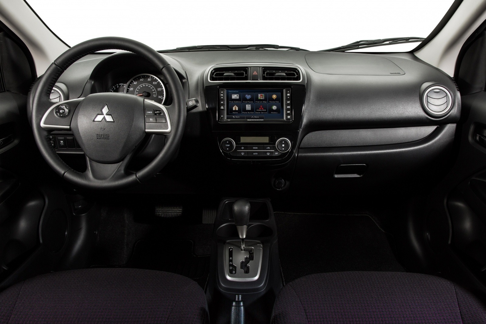 The 2014 Mitsubishi Mirage ES interior presents a clean, uncluttered dashboard with a touchscreen infotainment display, simple HVAC controls, and a Mitsubishi-branded steering wheel with audio switches. A CVT shifter occupies the narrow center console, keeping the cabin layout easy to navigate despite its budget-focused design.