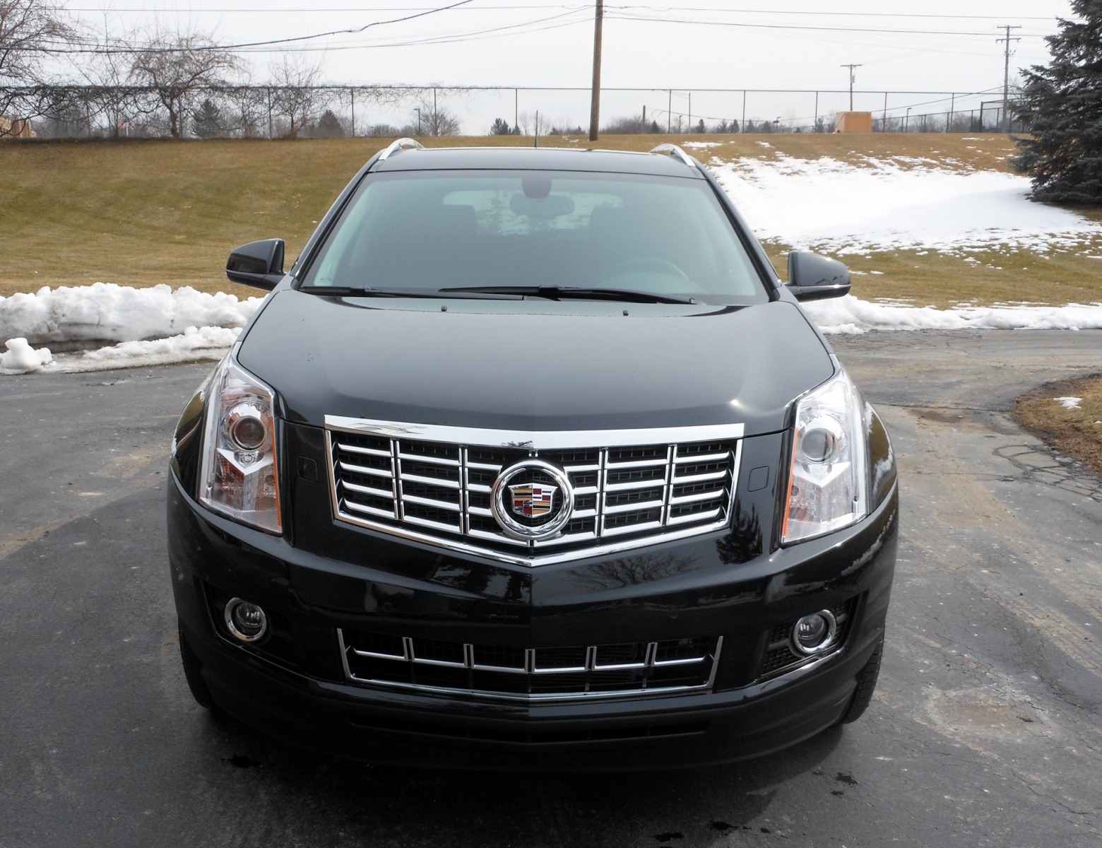 A straight-on front view of the 2013 Cadillac SRX Performance AWD shows the chrome vertical-bar grille with center Cadillac crest, angular HID headlights, and lower fog light openings. The bold front end communicates the SRX's premium crossover character.