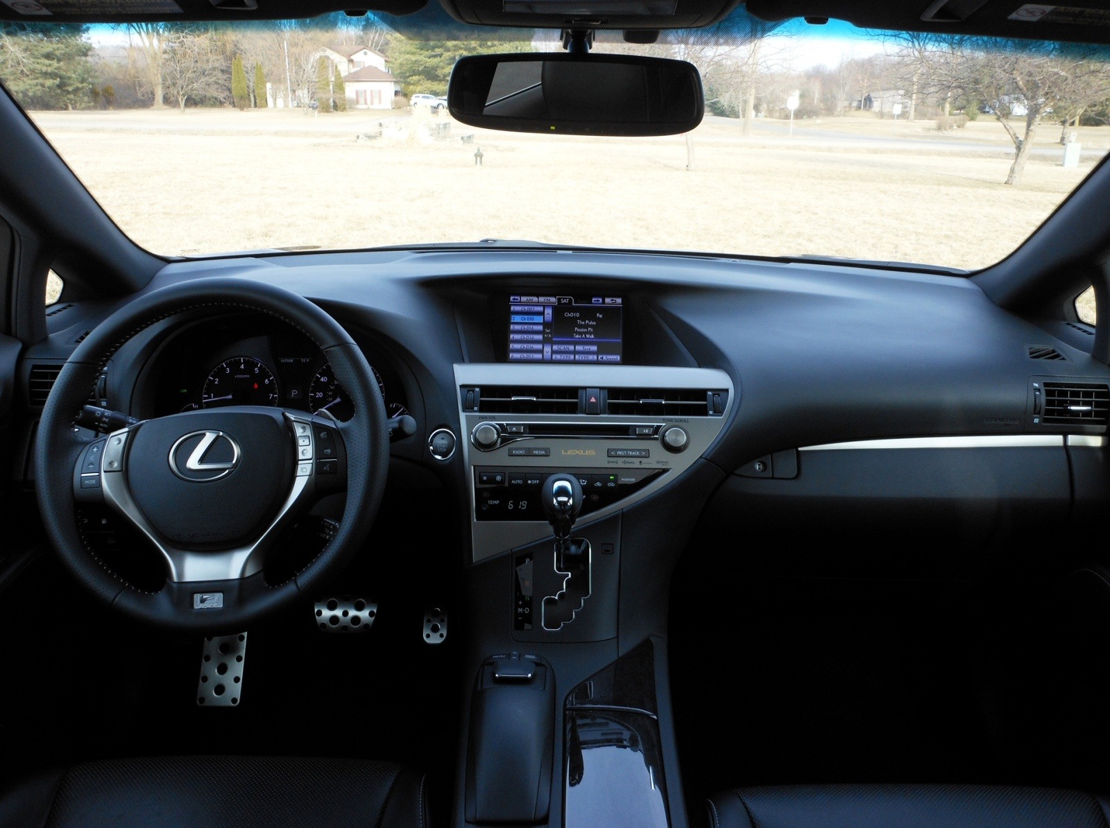 The 2013 Lexus RX 350 F-Sport interior features a black leather-trimmed dashboard with the Lexus steering wheel prominently displaying the brand logo. F-Sport aluminum sport pedals are visible, along with the navigation display and full-width instrument panel layout.