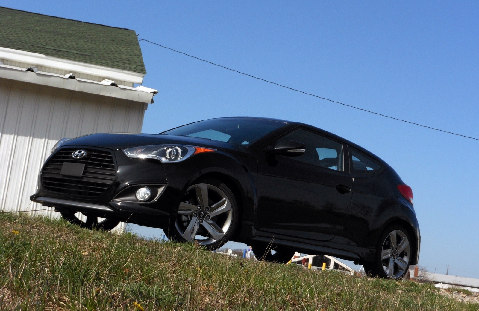 Parked near a white barn-style building, the 2013 Hyundai Veloster Turbo is photographed from a low front three-quarter angle that emphasizes the sweeping roofline and wide front fascia. The open grass and rural backdrop provide strong contrast against the all-black hatchback.