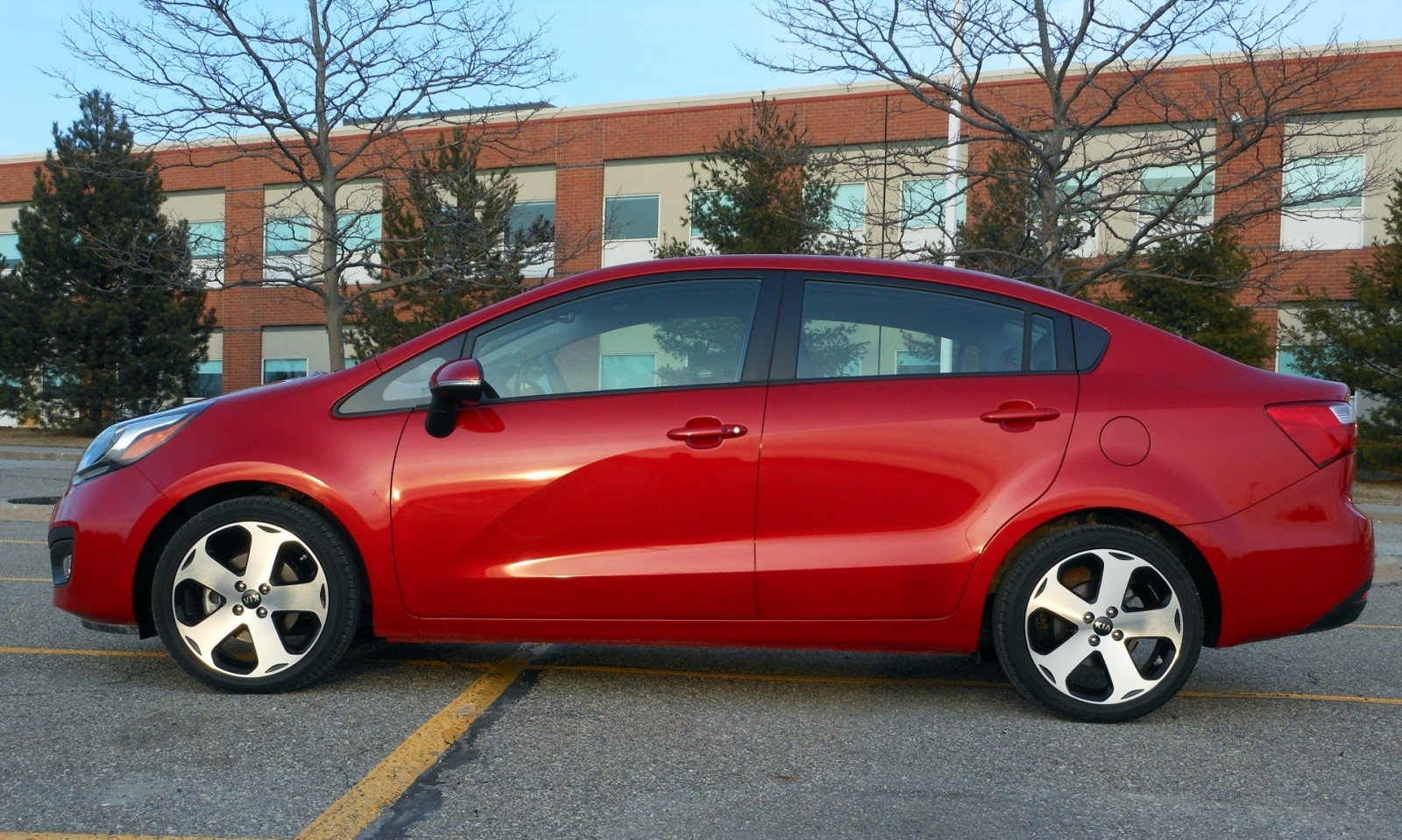 The driver's side of the 2013 Kia Rio SX Sedan is shown in full, revealing the clean, flowing roofline and notchback trunk of the four-door body. The 17-inch machine-finished alloy wheels and Signal Red paint are clearly visible against the parking lot backdrop.