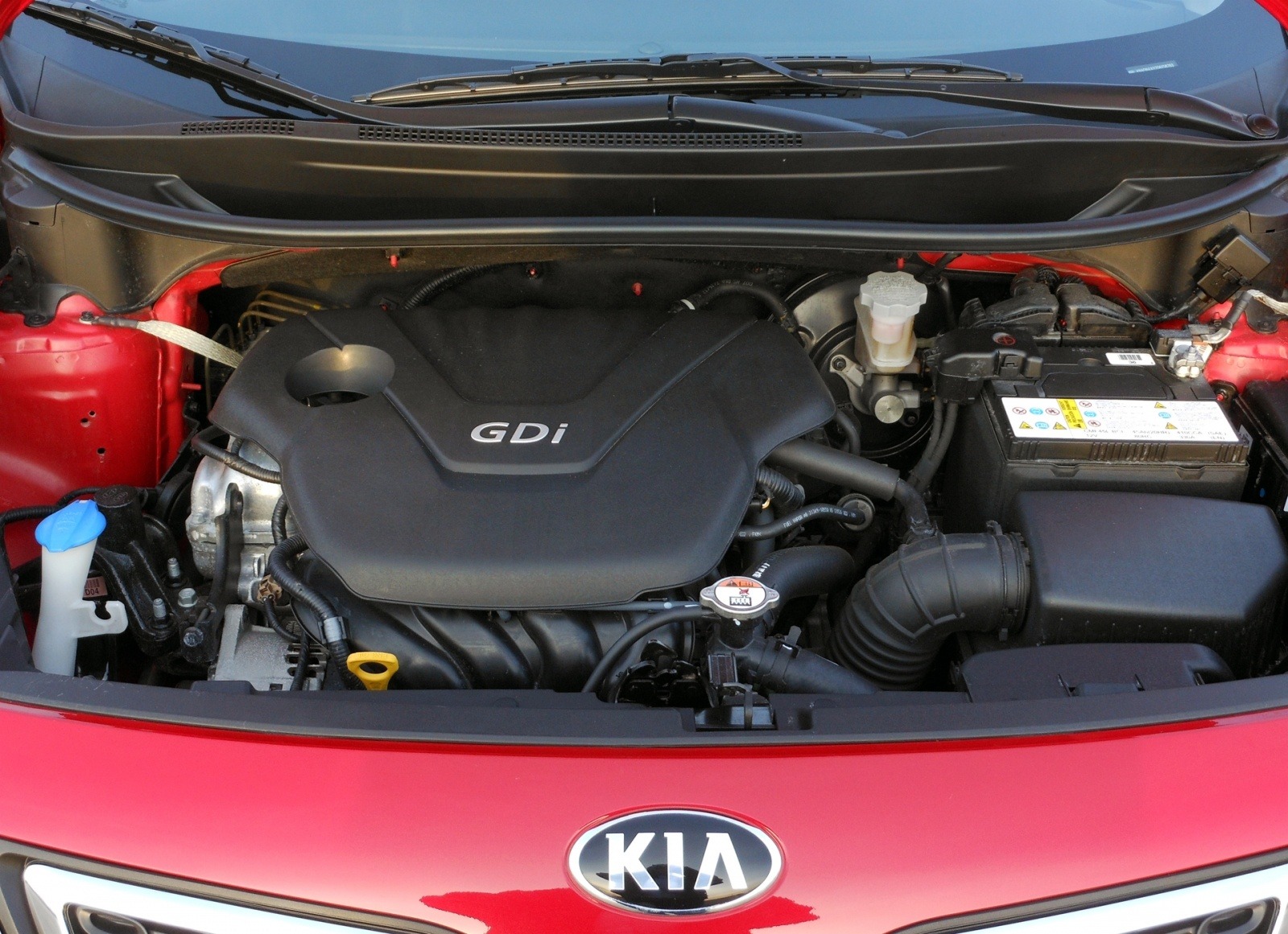 The engine bay of the 2013 Kia Rio SX Sedan reveals the 1.6-liter GDI four-cylinder, rated at 138 horsepower and 123 lb-ft of torque. The GDi-labeled valve cover sits at center, flanked by the battery, coolant reservoir, and air intake plumbing.