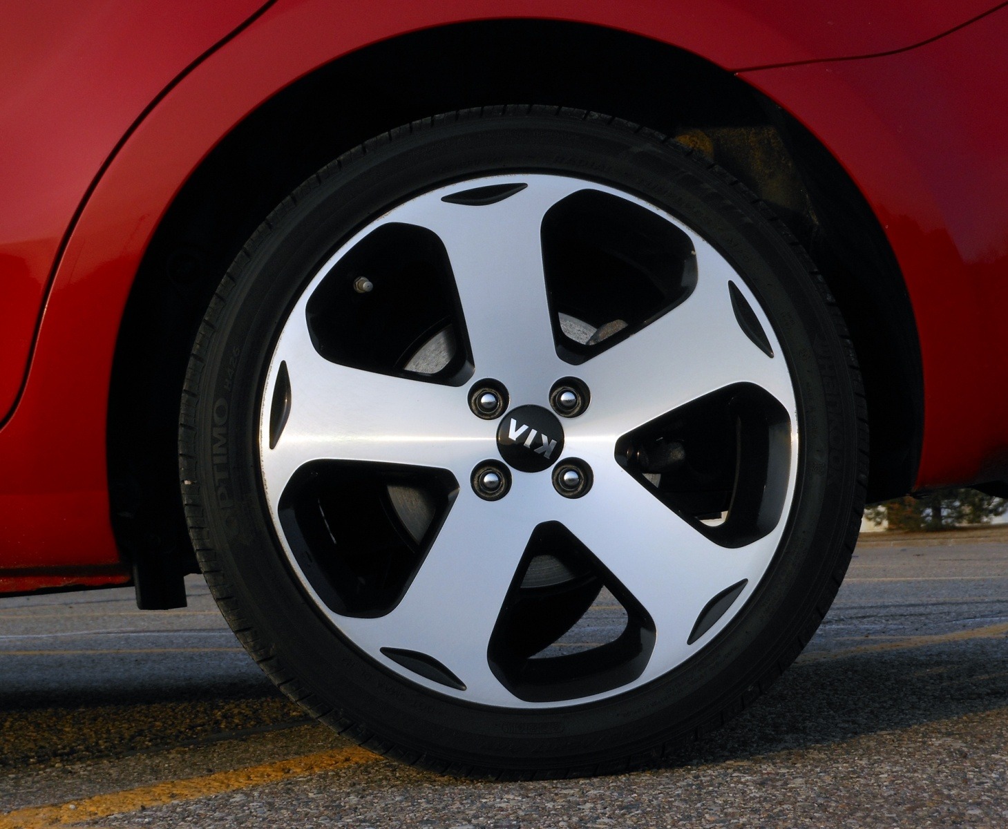 A close-up of the 2013 Kia Rio SX Sedan's 17-inch machine-finished alloy wheel shows the five-spoke design with contrasting machined faces and dark pockets. The Kia-badged center cap and Kumho Ecsta tire sidewall are clearly visible.