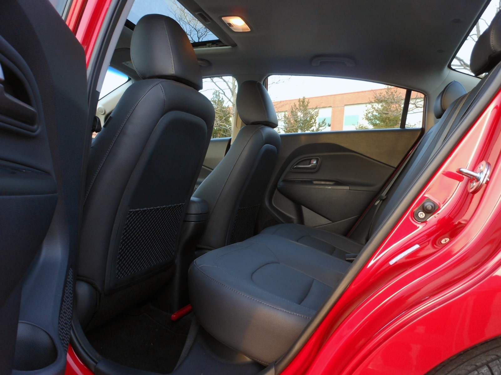 The rear seat of the 2013 Kia Rio SX Sedan is trimmed in black leather and offers reasonable room for a subcompact. The door panel features a mesh pocket, and the open sunroof is visible above the headliner.
