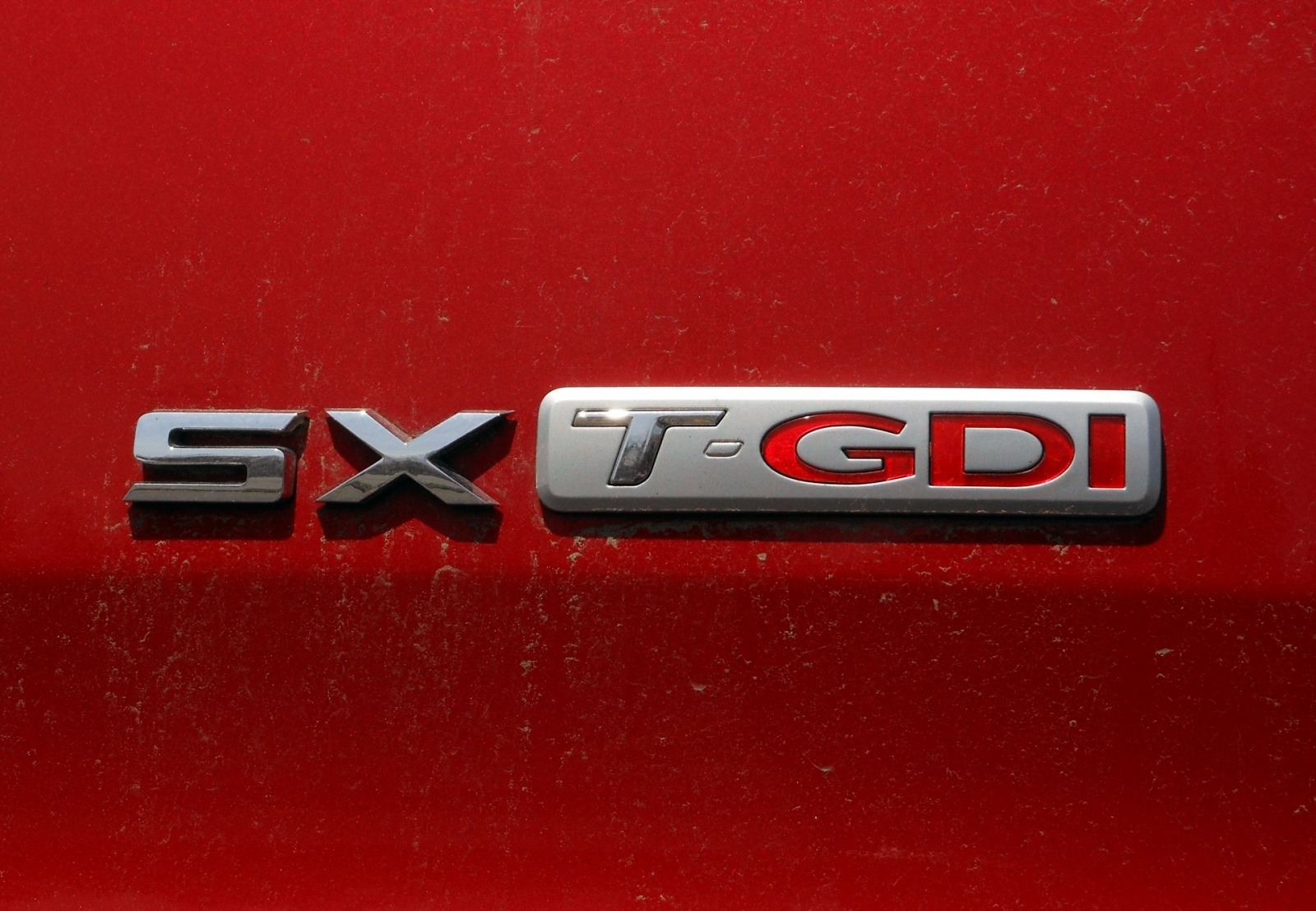 A close-up of the SX T-GDI badge on the tailgate of the 2013 Kia Sportage SX AWD, denoting the turbocharged Gasoline Direct Injection engine. The chrome SX letters sit alongside a silver and red T-GDI emblem, identifying this as the performance-oriented top trim in the Sportage lineup.