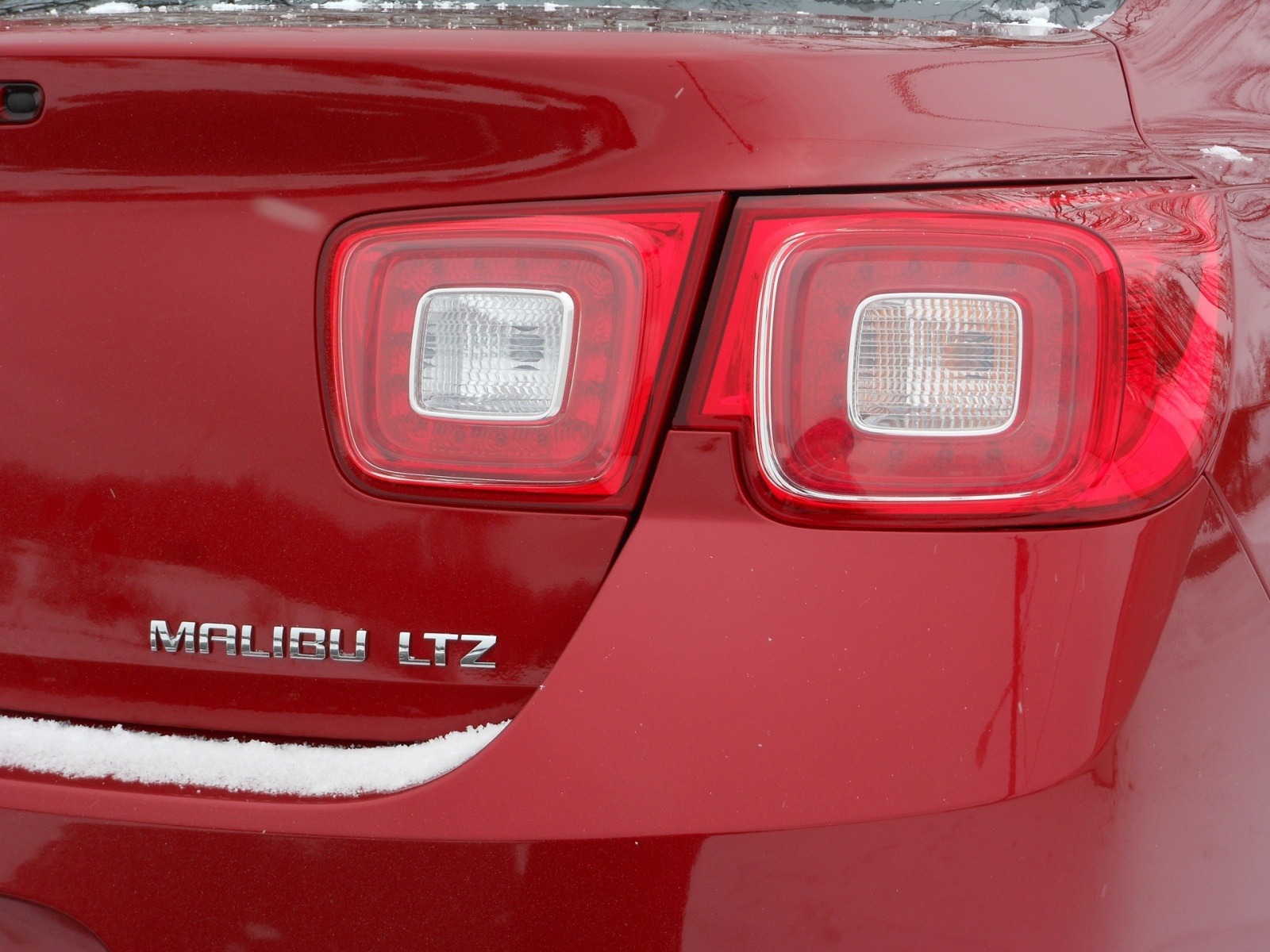 A tight closeup of the 2013 Chevrolet Malibu Turbo's driver-side taillight cluster shows the dual square lens layout set into the red housing, with the chrome "Malibu LTZ" badge and trim strip below dusted with snow. The rectangular taillight graphic gives the Malibu's rear a distinctive, upscale look.