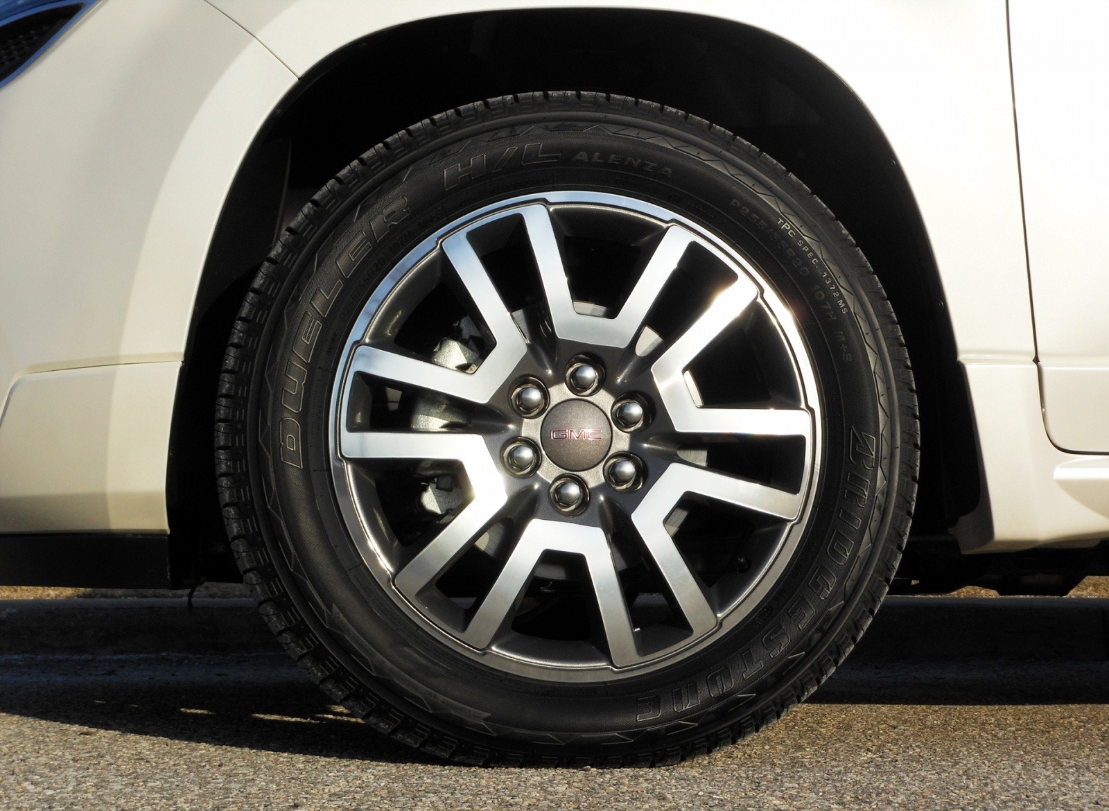 The 2013 GMC Acadia Denali rolls on standard 20-inch machined-face alloy wheels with dark-painted pockets, wrapped in Bridgestone Dueler H/L Alenza all-season tires. The GMC logo center cap and the seven double-spoke design are exclusive to the top-tier Denali trim.