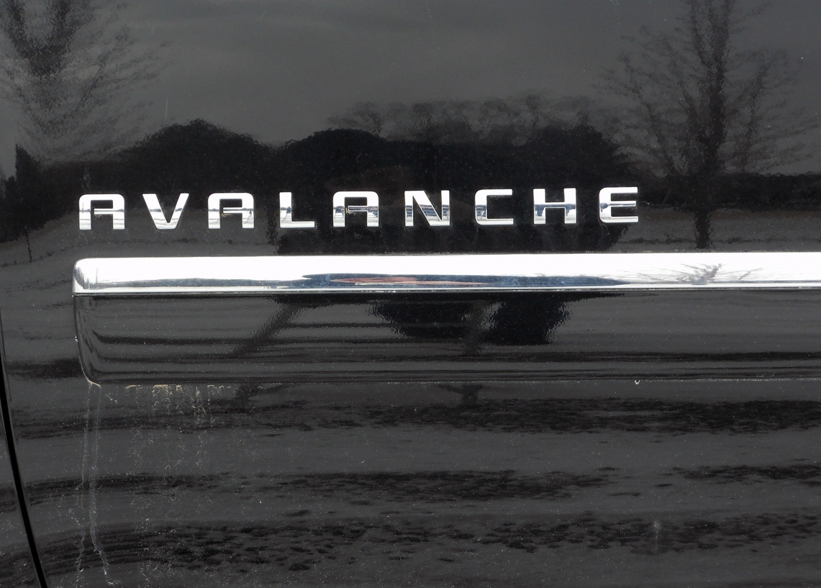 The chrome Avalanche lettering and bodyside molding on the 2013 Chevrolet Avalanche LTZ Black Diamond are set against the truck's gloss black paint. The Black Diamond edition's monochromatic exterior makes these chrome accents stand out prominently.