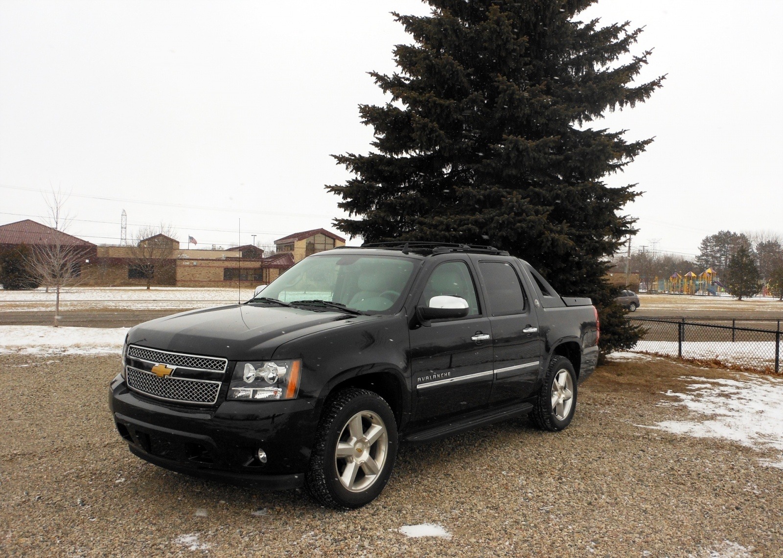 The 2013 Chevrolet Avalanche LTZ Black Diamond is photographed in a snowy suburban setting, showing its broad chrome grille and sunroof-equipped roofline. The truck's full-size proportions are well framed against the winter landscape.