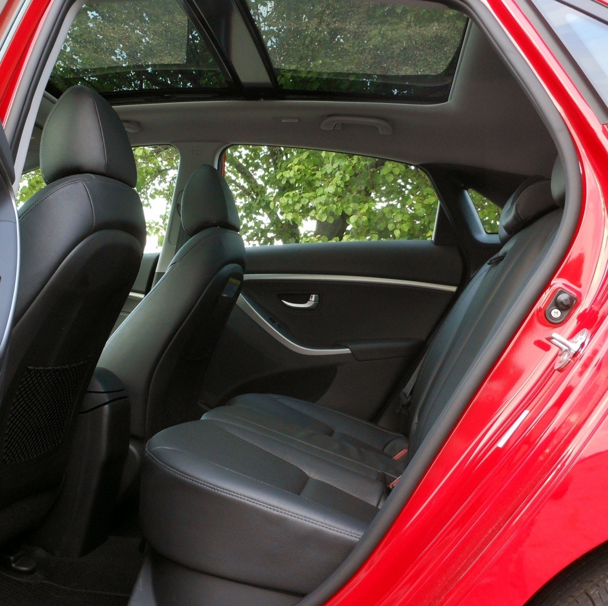 The rear cabin of the 2013 Hyundai Elantra GT offers black leather seating with a panoramic sunroof overhead, viewed through the open rear door of the red hatchback.