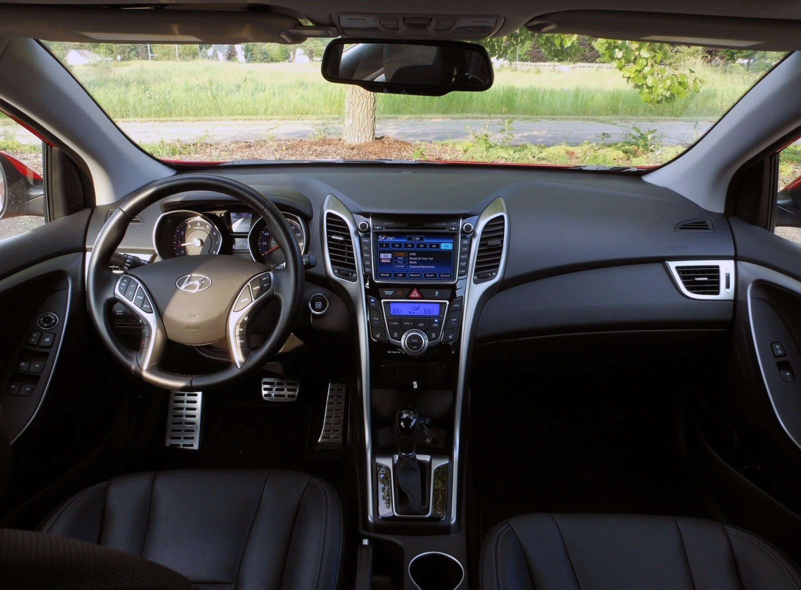 The 2013 Hyundai Elantra GT features a sport-oriented black interior with a touchscreen infotainment display, aluminum sport pedals, and a clean center console with automatic transmission shifter.