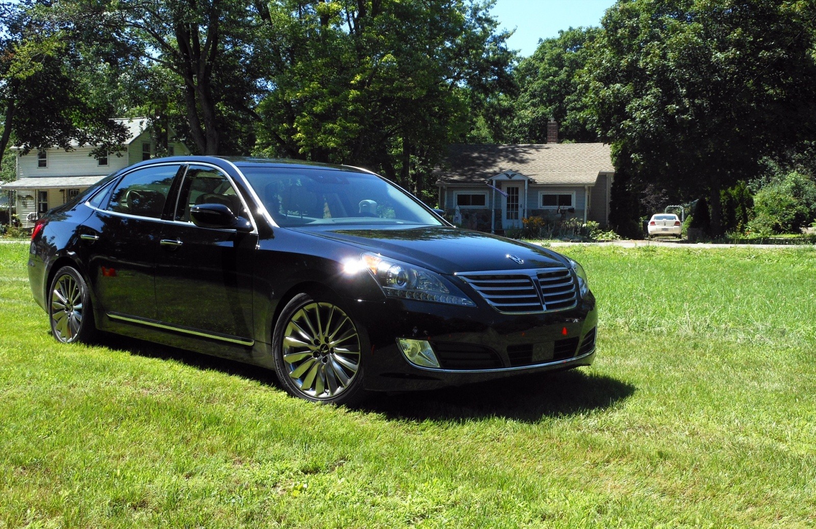 A dark 2014 Hyundai Equus sits on a manicured grass lawn for a front three-quarter hero shot, showing off the wide stance, chrome grille surround, and sophisticated exterior design of Hyundai's top-of-the-line luxury sedan.