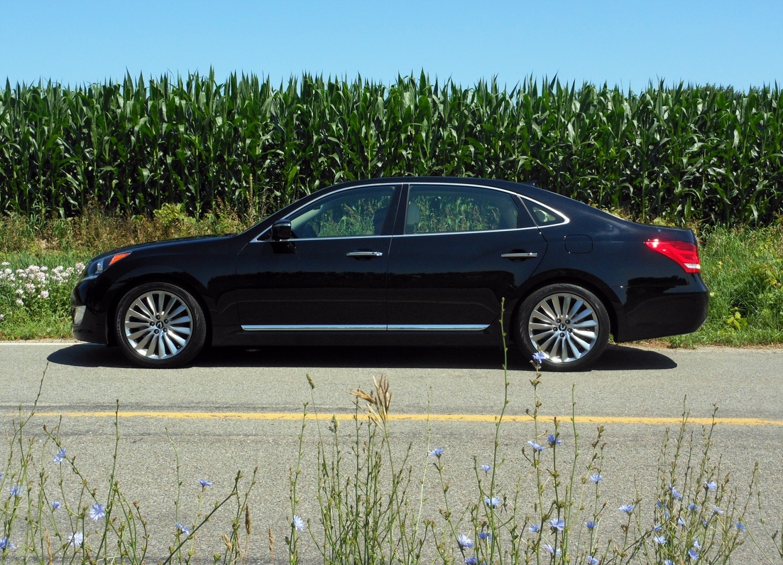 The Equus's long, low silhouette is shown to full effect in this broadside shot against a summer cornfield. The chrome window surround, body-side molding, and multi-spoke wheels reinforce the sedan's formal luxury proportions.