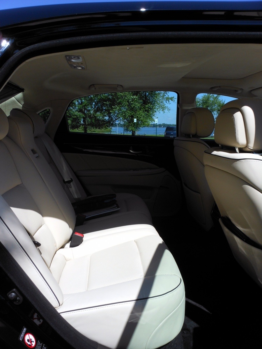 The Equus's rear cabin is a study in understated luxury, with broad cream leather seats, generous legroom, and a panoramic side window view. Overhead mood lighting and a foldable center armrest underscore the limo-like accommodations on offer.