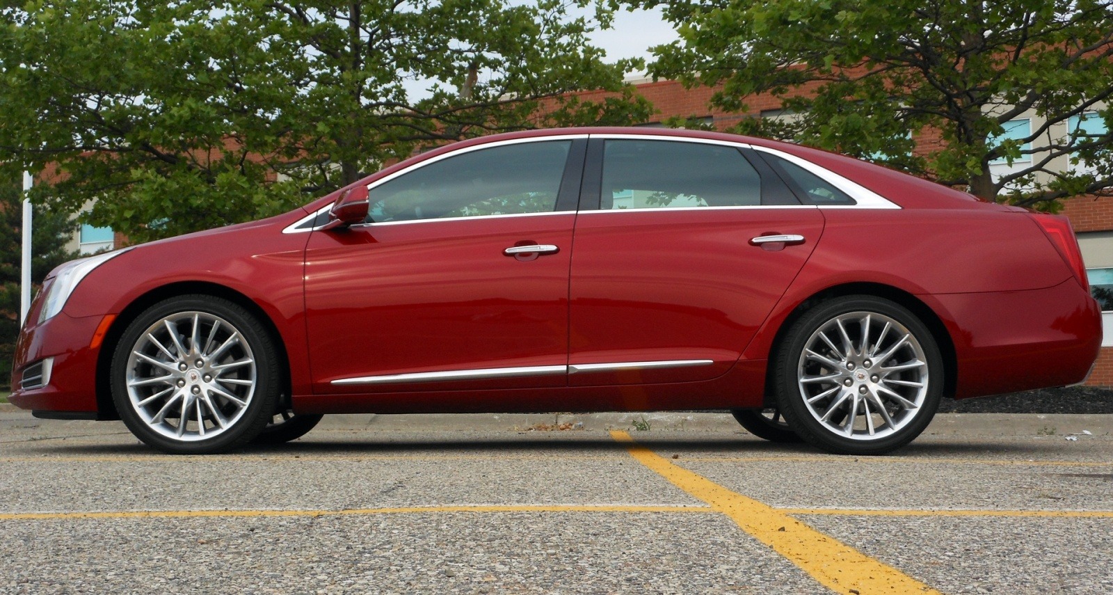 A clean profile shot of the 2013 Cadillac XTS Platinum in crystal red, showing the long sedan's proportions with chrome window trim, flush door handles, and multi-spoke alloy wheels.