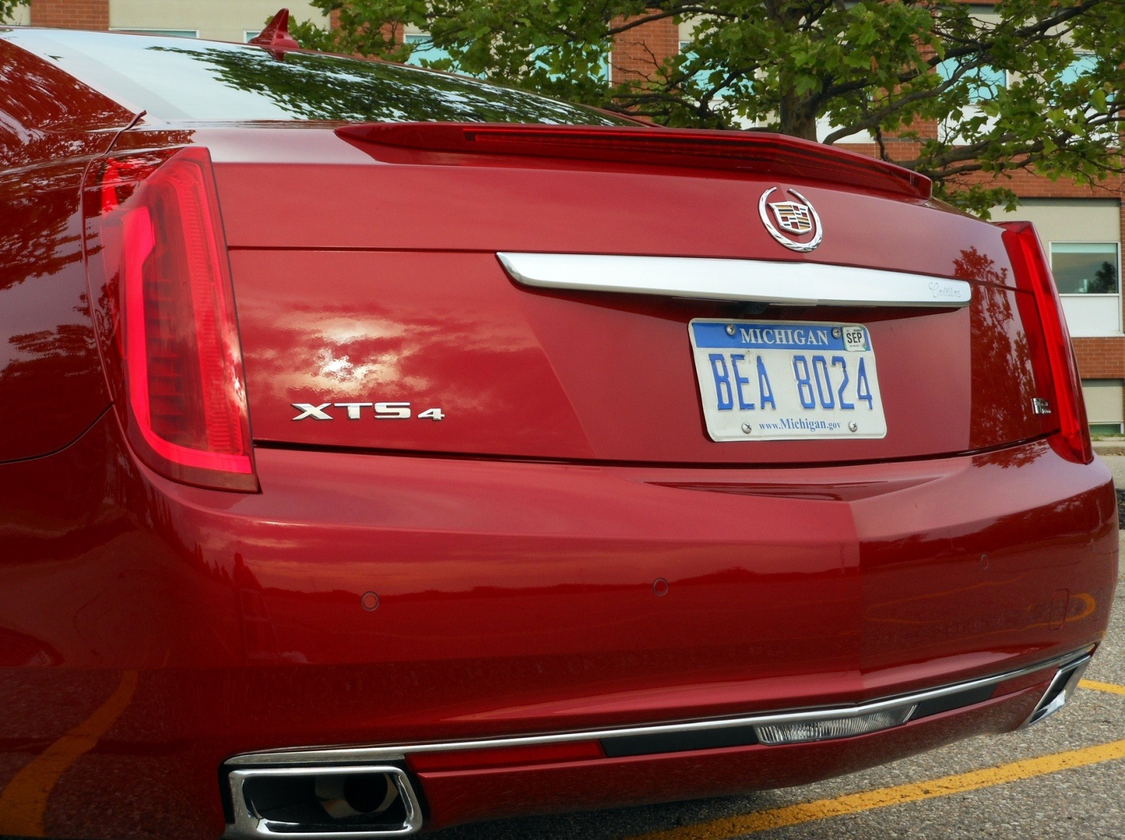 Angled close-up of the XTS Platinum's rear decklid shows the chrome strip, Cadillac crest, and XTS4 script badge in sharp relief against the deep red paint. The vertical taillamp blade and chrome exhaust tip are visible at the edges of the frame.