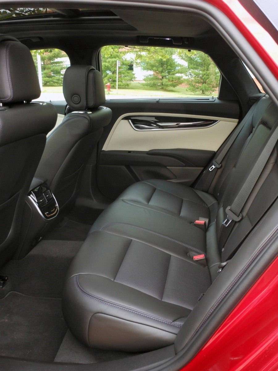 The rear cabin of the XTS Platinum offers generous legroom with wide, well-bolstered black leather seats and a light-colored trim panel spanning the seatback. Integrated rear controls on the door panel and a panoramic feel through the large windows confirm the sedan's limousine-like rear-passenger priority.