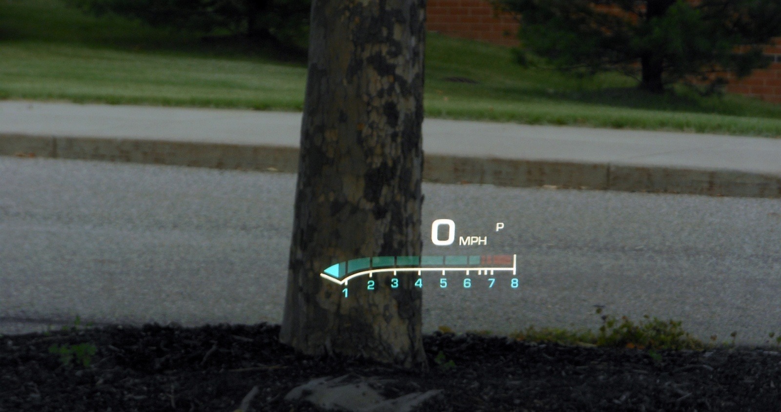 The 2013 Cadillac XTS Platinum features a full-color head-up display projected onto the windshield, showing speed, transmission position, and a power flow indicator gauge.