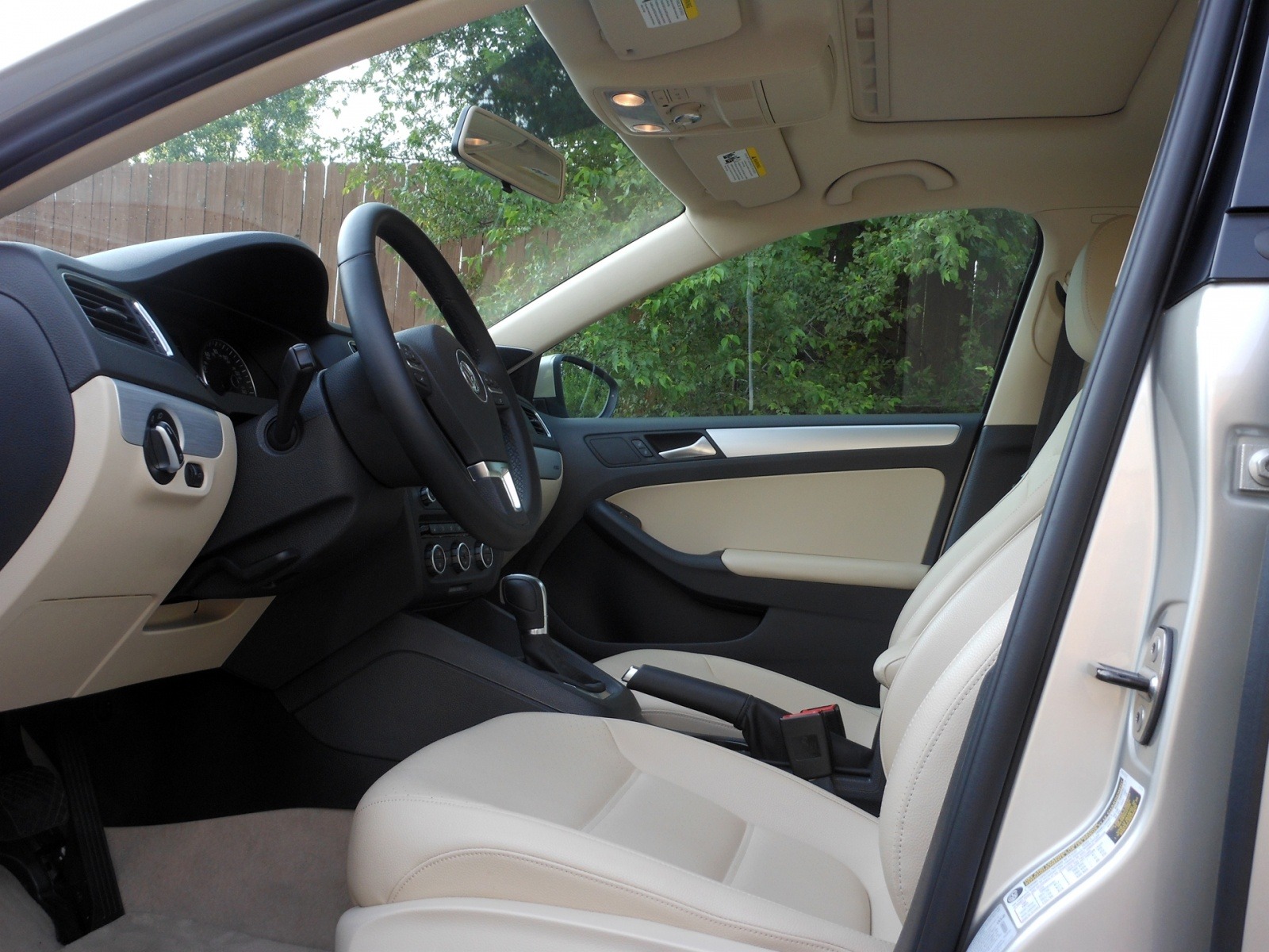 The driver's side view of the 2013 Volkswagen Jetta Hybrid interior shows beige leather front seats, the VW steering wheel, center console with gear selector, and trim-level climate controls. The two-tone beige and black interior reflects a premium feel uncommon at this price point.