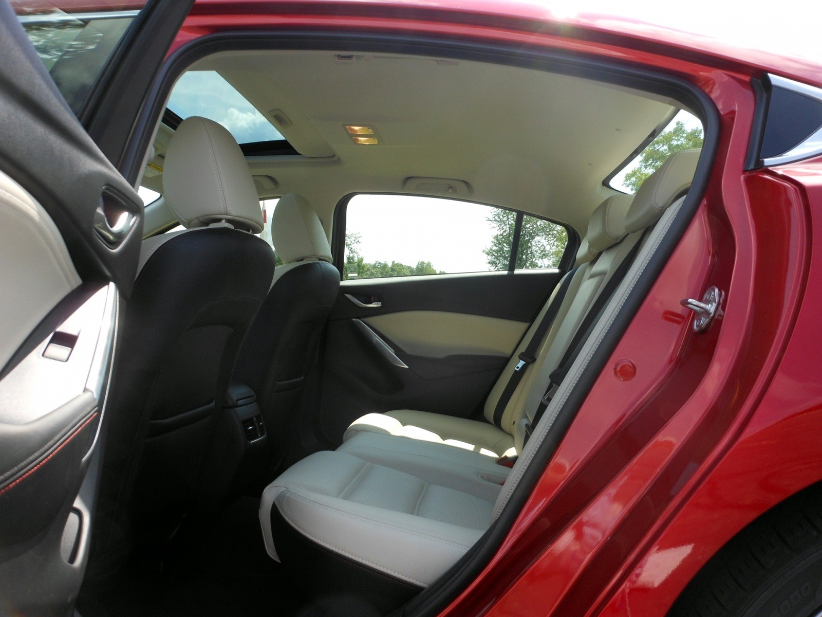 The Mazda6's rear cabin offers a generous bench in sand leather with substantial cushioning and good headroom, aided by the panoramic sunroof overhead. The sloping roofline that gives the car its sporty exterior profile is well managed inside, leaving rear passengers with adequate space for a midsize sedan.
