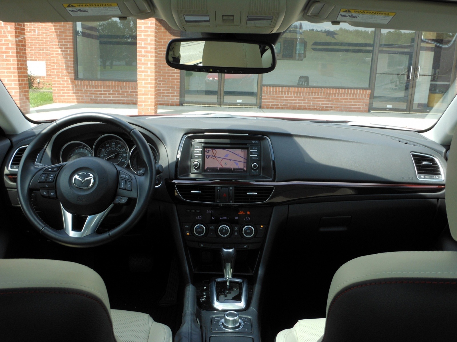 The full dashboard of the Grand Touring presents a well-organized layout, with a centrally mounted navigation screen flanked by dual-zone climate controls and a rotary gear selector. Wood-tone trim accents run the length of the dash, while the light sand leather seats and headliner keep the cabin bright.