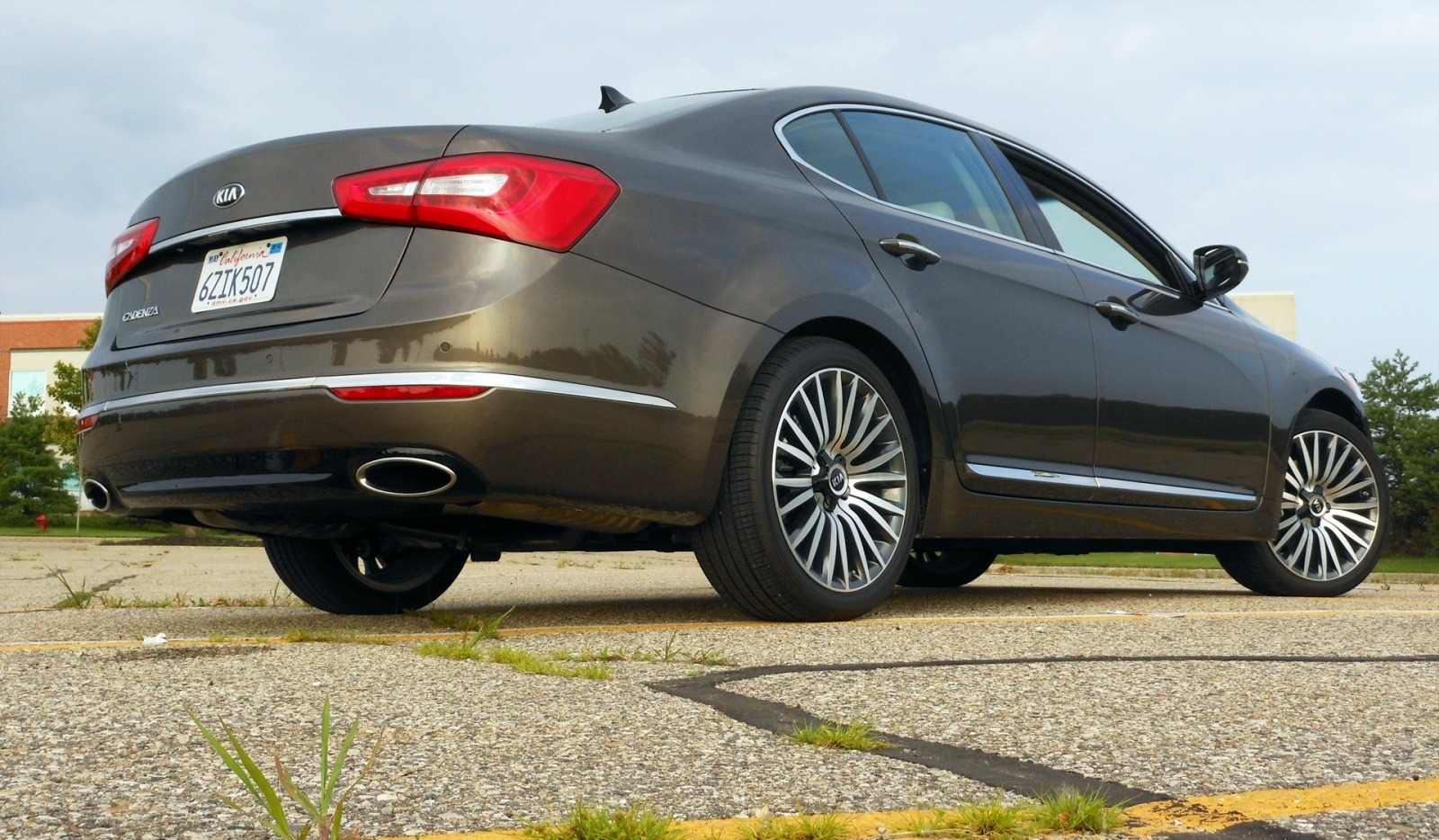A rear three-quarter view of the 2014 Kia Cadenza in brown metallic paint, showing the fastback-influenced roofline, full-width LED taillights, dual exhaust outlets, and large multi-spoke alloy wheels that give the flagship sedan a distinctly upscale presence.