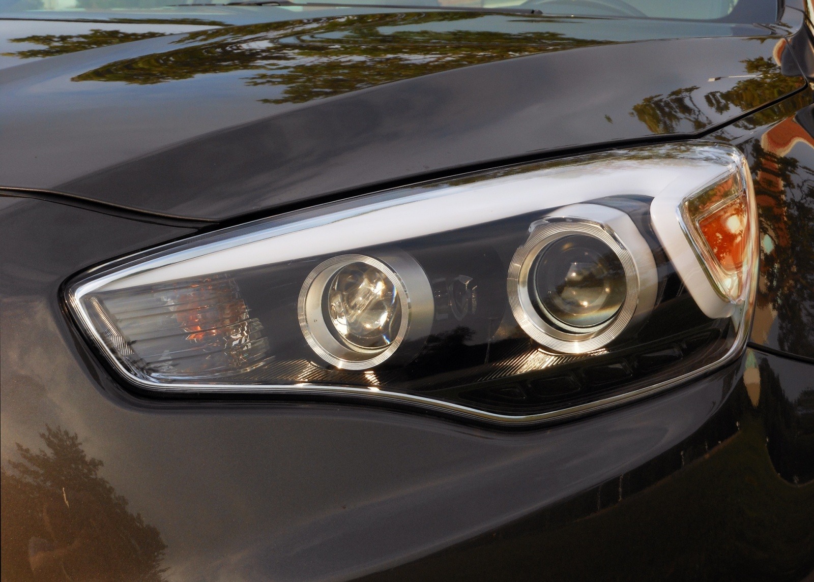 A close-up of the 2014 Kia Cadenza's swept projector headlight assembly, showing the dual projector lenses set within a darkened housing and chrome accent strip, giving the flagship sedan a sharp and modern front-end appearance.