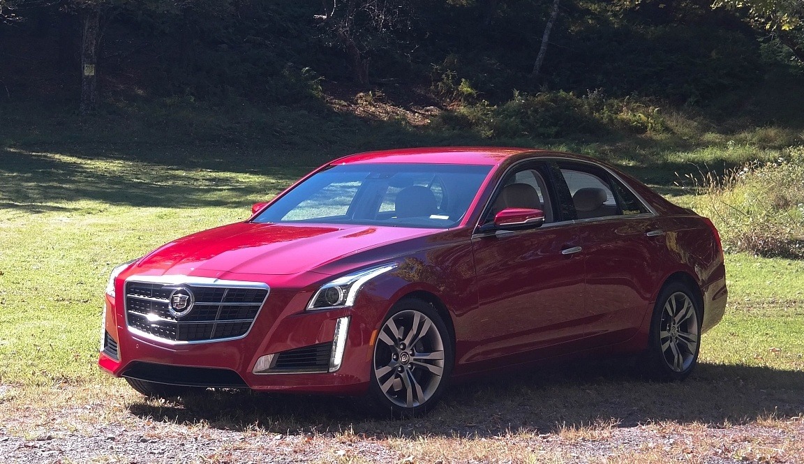 The red 2014 Cadillac CTS V-Sport is shown from a low front side angle that emphasizes the sedan's long hood, sharp character lines, and signature L-shaped LED daytime running lights. The mesh grille and chrome accents add a polished touch to the aggressive front fascia.