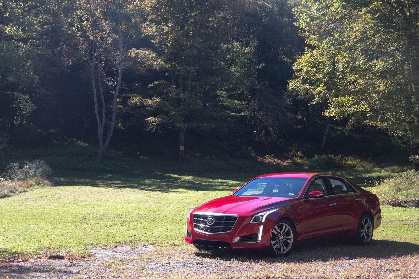 The red 2014 Cadillac CTS V-Sport sits in a wooded clearing, its bold front fascia and gleaming body catching dappled sunlight through the autumn trees. The wide-open setting underscores the sedan's road-trip capability alongside its sport-luxury credentials.