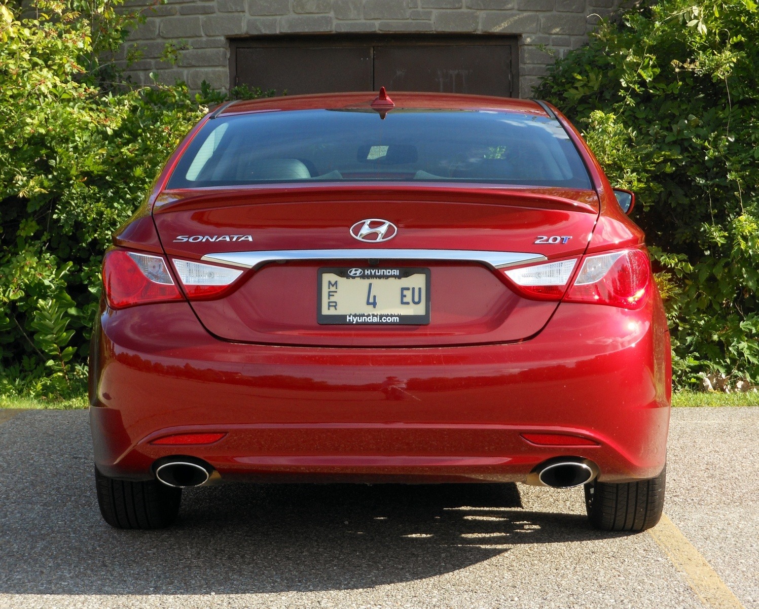 The rear of the 2013 Hyundai Sonata SE 2.0T in red is shown straight-on in a green summer landscape, displaying the Hyundai H emblem, Sonata and 2.0T badges, chrome trunk lid strip, LED tail light elements, dual exhaust tips, and a Hyundai manufacturer press plate.
